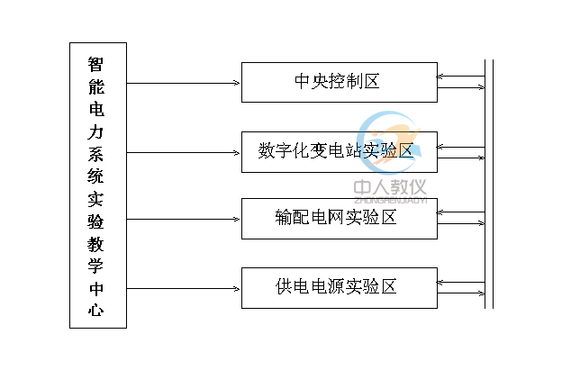 智能电力系统实验教学中心由中央控制区、数字化变电站实验区、输配电网实验区、供电电源实验区等四个实验区组成系统。各实验区之间由电缆连接,完全按照电力系统规范设计,具有很强地扩展性,各室内容、规模均可增加,接口可以接纳电力系统新技术新设备。实验教学中心组成示意图如图所示。